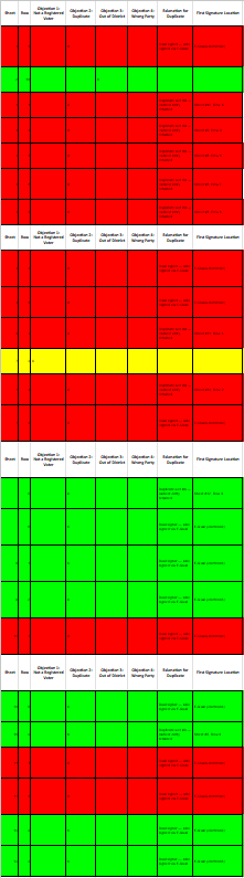Red lines are challenged signatures with problems, green are challenged signatures that are valid, yellow is unconfirmed pending county recorder’s report. If we credit you the unverified that’s 25 of 54. Your chatbot scored a 46%, less than half. I do believe that’s a failing grade.
