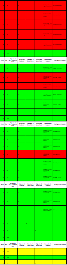 The AI generated spreadsheet you turned in to complain about my petitions? Missing sheet numbers. Falsely claiming people were out of district or not registered. More than half of the assertions of duplicates were so clearly wrong that no human would have made that error.